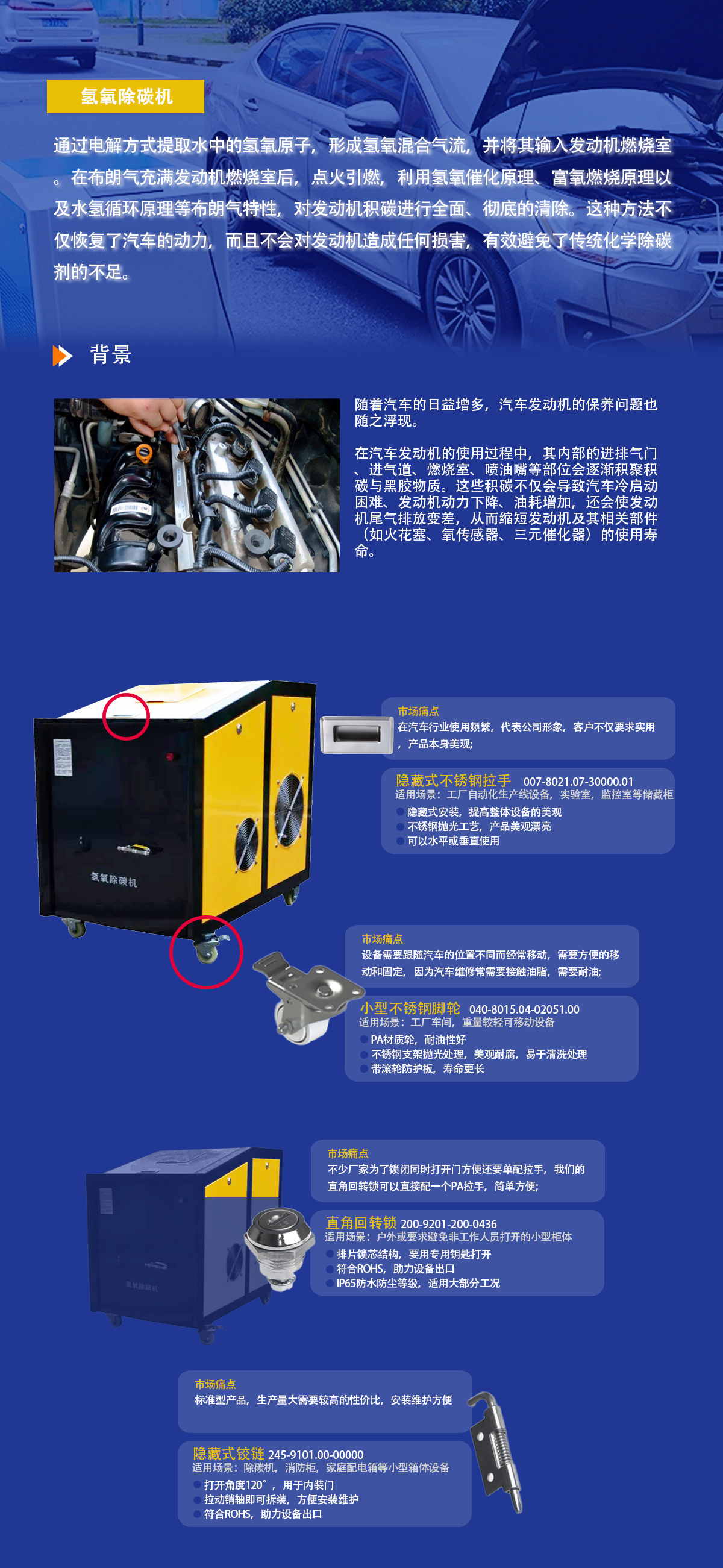 设备需要跟随汽车的位置不同而经常移动,需要方便的移动和固定,因为汽车维修常需要接触油脂,需要耐油产品特点:小型不锈钢脚轮:1: pa材质轮,耐油性好2: 不锈钢支架抛光处理,美观,耐腐性好,易于清洗处理3:带滚轮防护板,寿命更长应用场景:工厂车间,重量较轻可移动设备市场问题点:设备在汽车行业使用频繁,代表公司形象,客户不仅要求实用,产品本身美观产品特点:隐藏式不锈钢拉手:1: 隐藏式安装,提高整体设备的美观2: 不锈钢抛光工艺,产品美观漂亮3:可以水平或垂直使用应用场景:工厂自动化生产线设备,实验室,监控室等物品储藏柜市场问题点:标准型产品,生产量大需要较高的性价比,安装维护方便产品特点:1、打开角度120°,用于内装门2、拉动销轴即可拆装,方便安装维护3、符合rohs,助力设备出口应用场景:除碳机,消防柜,家庭配电箱等小型箱体设备