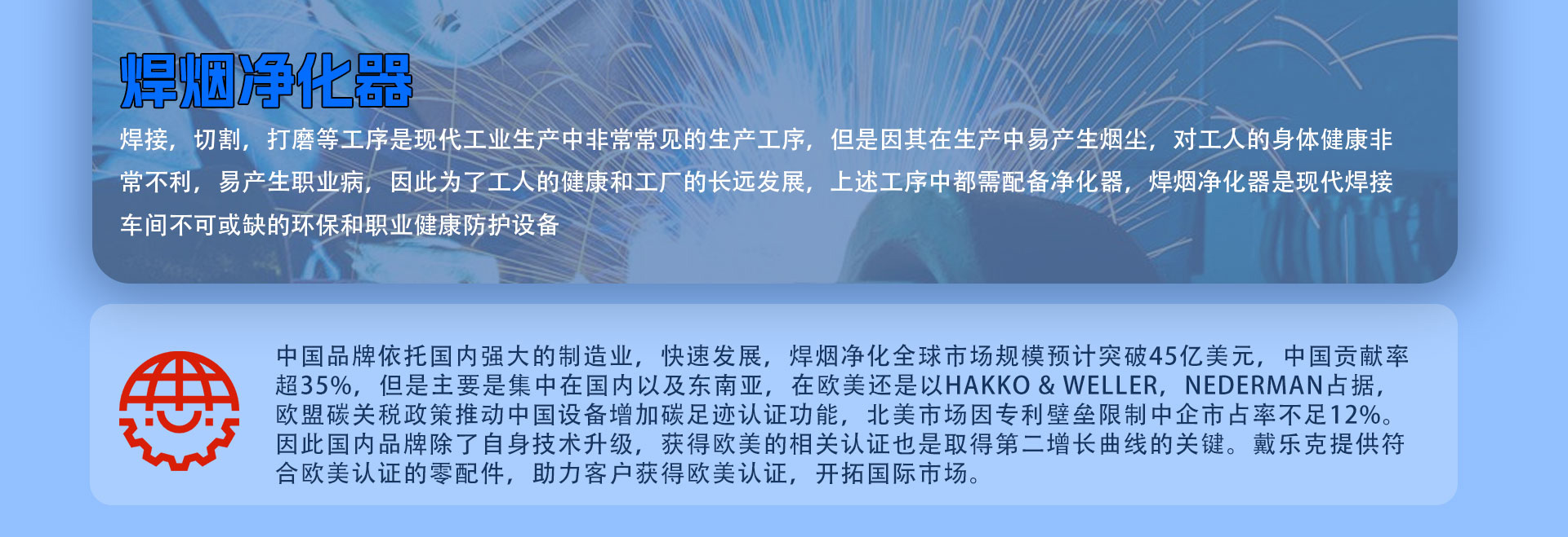 焊接,切割,打磨等工序是现代工业生产中非常常见的生产工序,但是因其在生产中易产生烟尘,对工人的身体健康非常不利,易产生职业病,因此为了工人的健康和工厂的长远发展,上述工序中都需配备净化器,焊烟净化器是现代焊接车间不可或缺的环保和职业健康防护设备