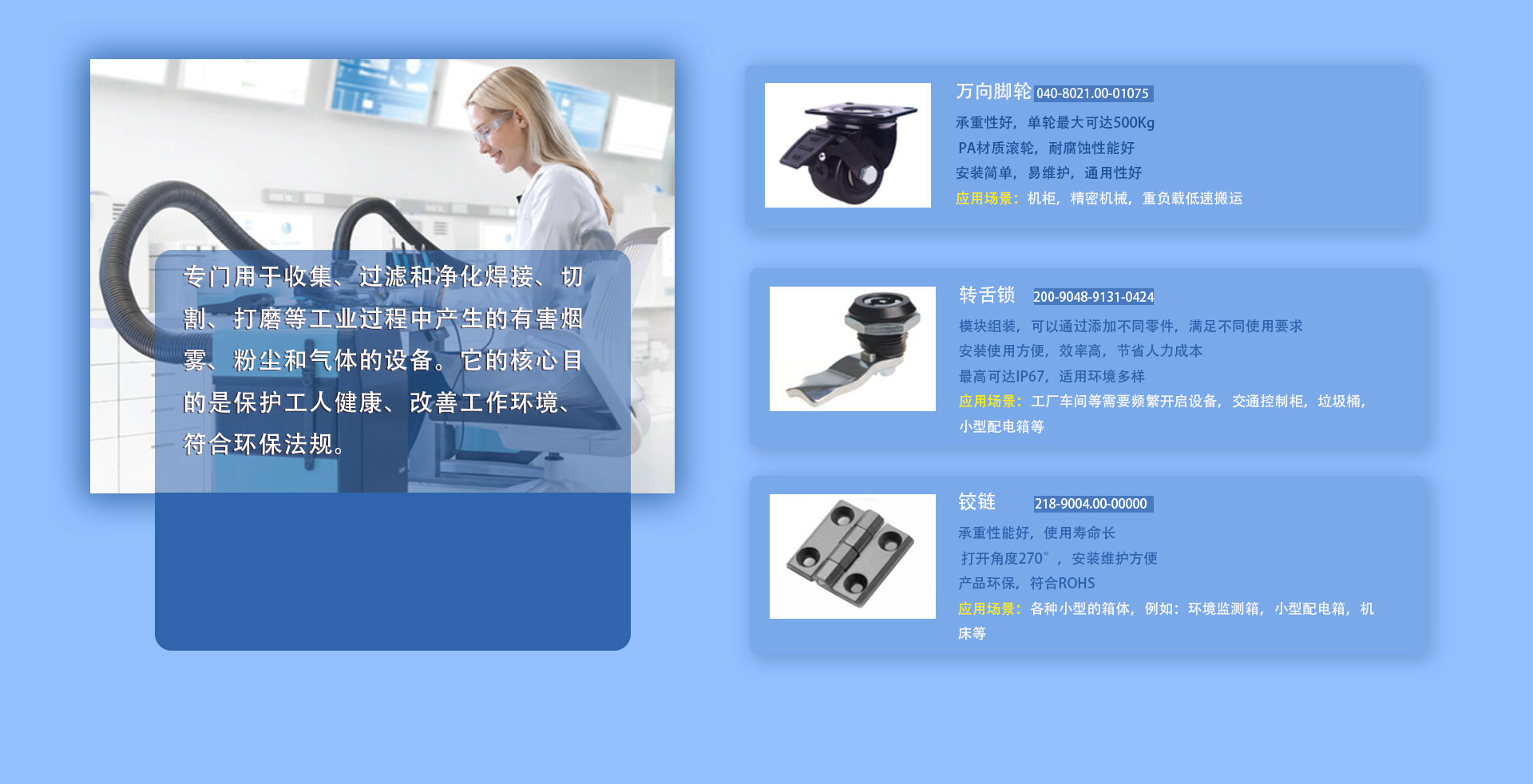 产品特点:万向脚轮1: 承重性好,单轮最大可达500kg2: pa材质滚轮,耐腐蚀性能好3:安装简单,易维护,通用性好应用场景:机柜,精密机械,重负载低速搬运产品特点:1: 模块组装,可以通过添加不同零件,满足不同使用要求2: 安装使用方便,效率高,节省人力成本3:最高可达ip67,适用环境多样应用场景:工厂车间等需要频繁开启设备,交通控制柜,垃圾桶,小型配电箱等产品特点:铰链1:承重性能好,使用寿命长2: 打开角度270°,安装维护方便3:产品环保,符合rohs应用场景:各种小型的箱体,例如:环境监测箱,小型配电箱,机床等